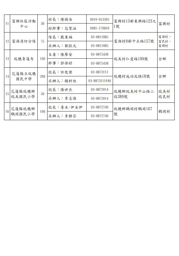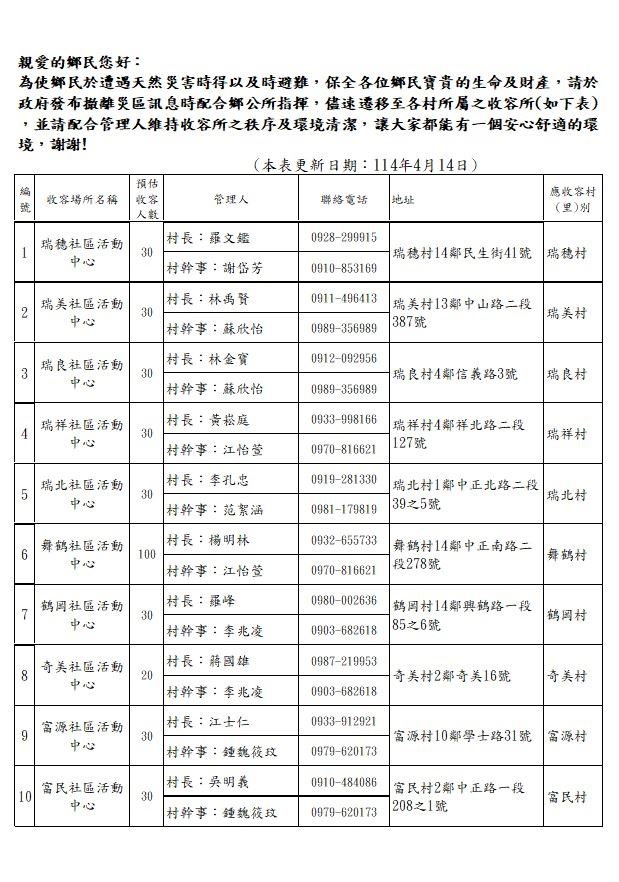 花蓮縣瑞穗鄉收容場所一覽表(更新日期:114年4月14日)